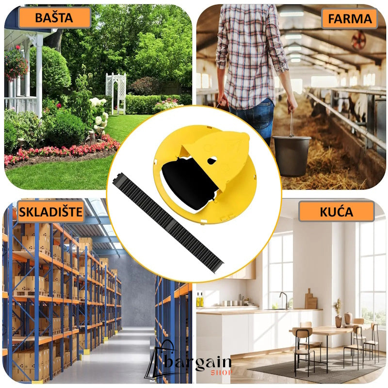 Zamka za miševe je jednostavna i učinkovita za korištenje na bilo kojem mjestu – u kući, bašti, štali ili skladištu. Postavite je na standardnu plastičnu kantu (koja nije uključena u paketu) i smjestite je na željeno mjesto. Mehanizam zamke brzo i efikasno hvata miševe, bez potrebe za otrovima. Savršen alat za sigurno i jednostavno rješenje problema s glodavcima, bilo gdje!